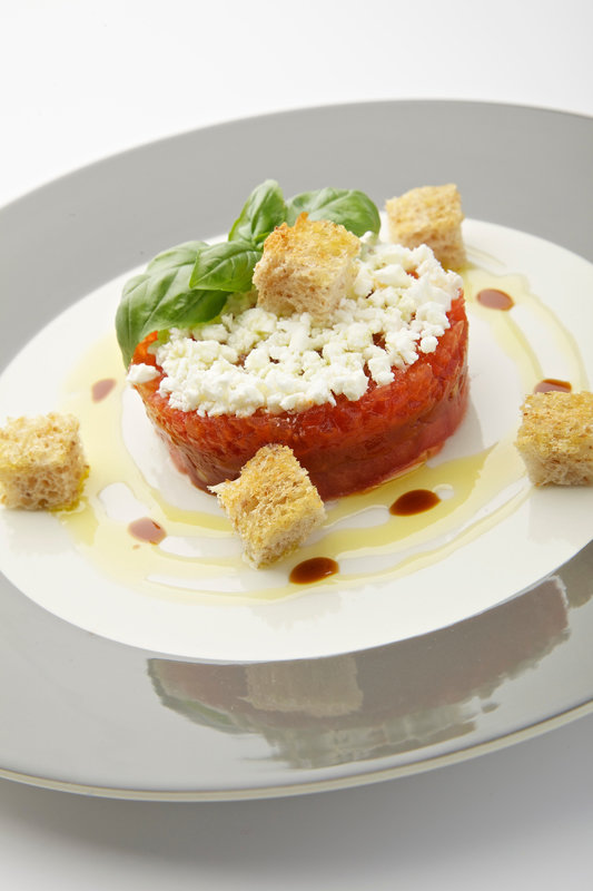 Steek de coeur de boeuf uit met een ring van 8-10 cm. Smeer wat tomatenjam hierop. Leg de plak onder in de ring en duw hier 2 cm watermeloentartaar op. Strijk glad en verdeel een laagje feta hierop.