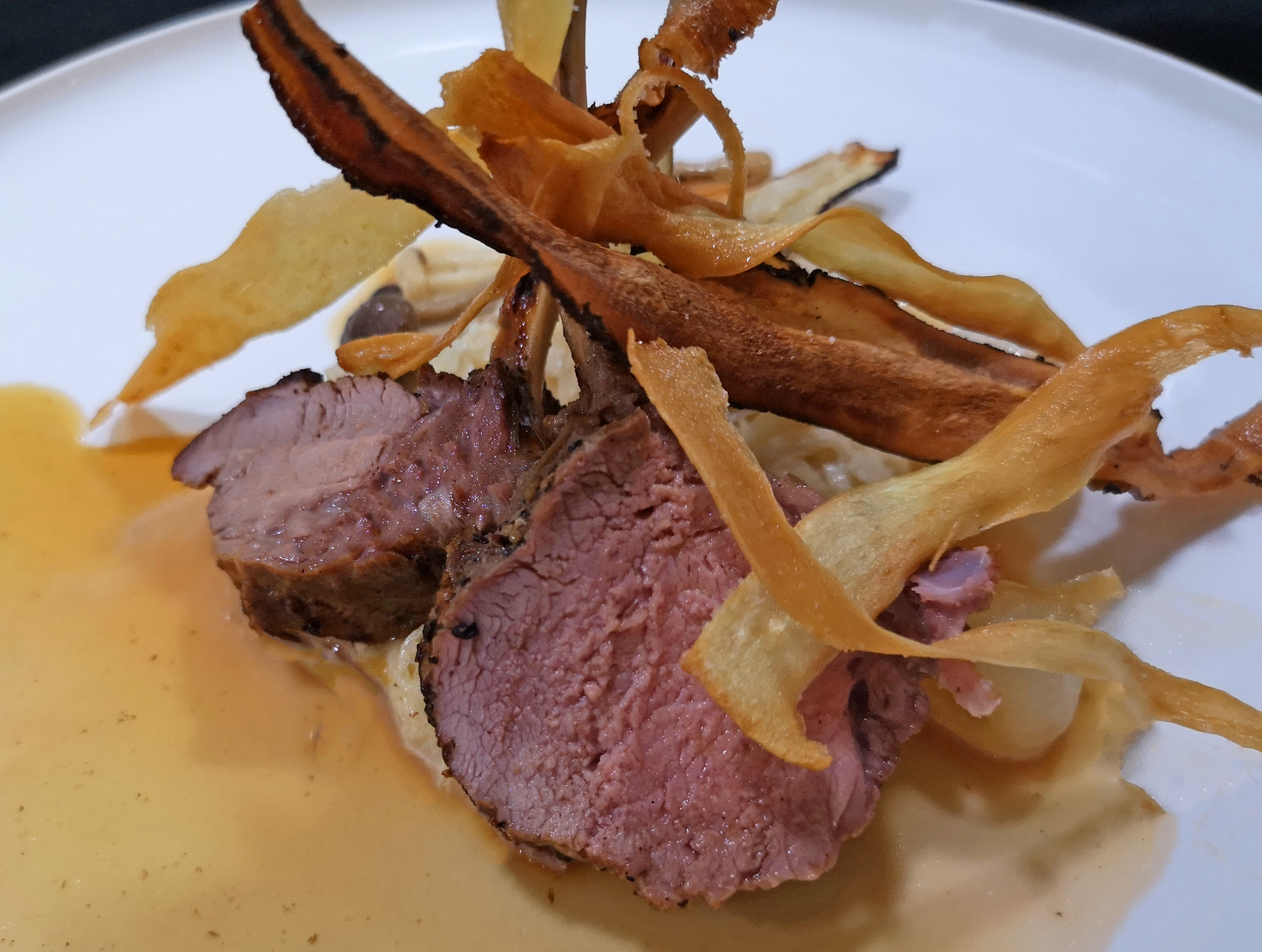 Leg een pluk zuurkool midden op de borden. Leg een kotelet tegen de zuurkool aan. Verdeel zilveruitjes en paddenstoeltjes over de borden. Lepel saus op de borden en versier met slierten pastinaak en