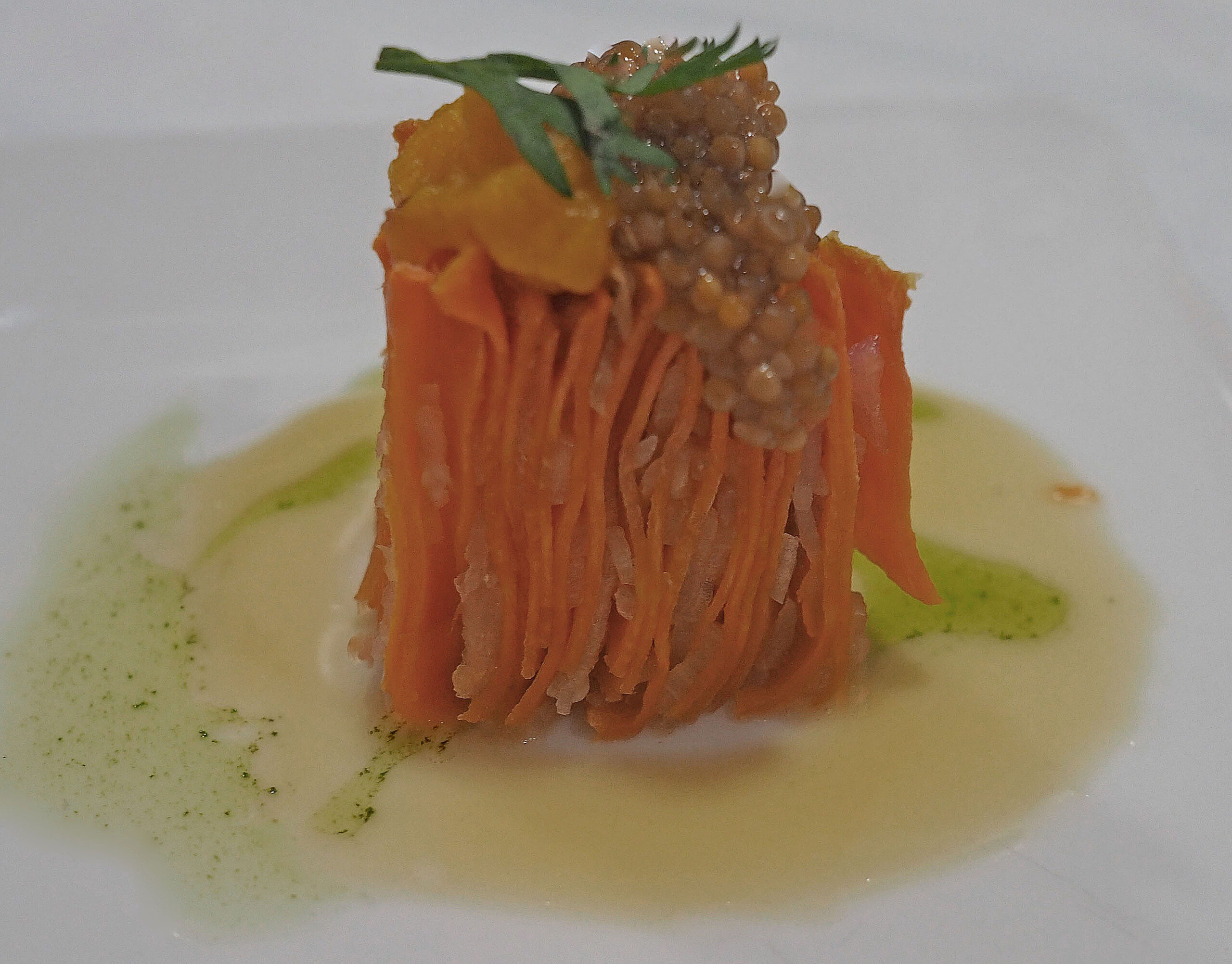 Monte del Frà Custoza Moregno 2019De luxe, houtgerijpte versie van de Cà del Magro uit een van de beste wijngaarden in Custoza vult hier het moeilijke gerecht met wortel, mosterdzaad en beur blanc prima aan. De wijn is een mix van 40% Garganega 30% Chardonnay 30% Cortese. Vol van smaak en hoewel eikenhout (70% in gebruikte vaten) gelagerd geen overdreven houttonen. Lekker sappig, boterig maar ook genoeg frisheid om tegen de mosterd op te kunnen.