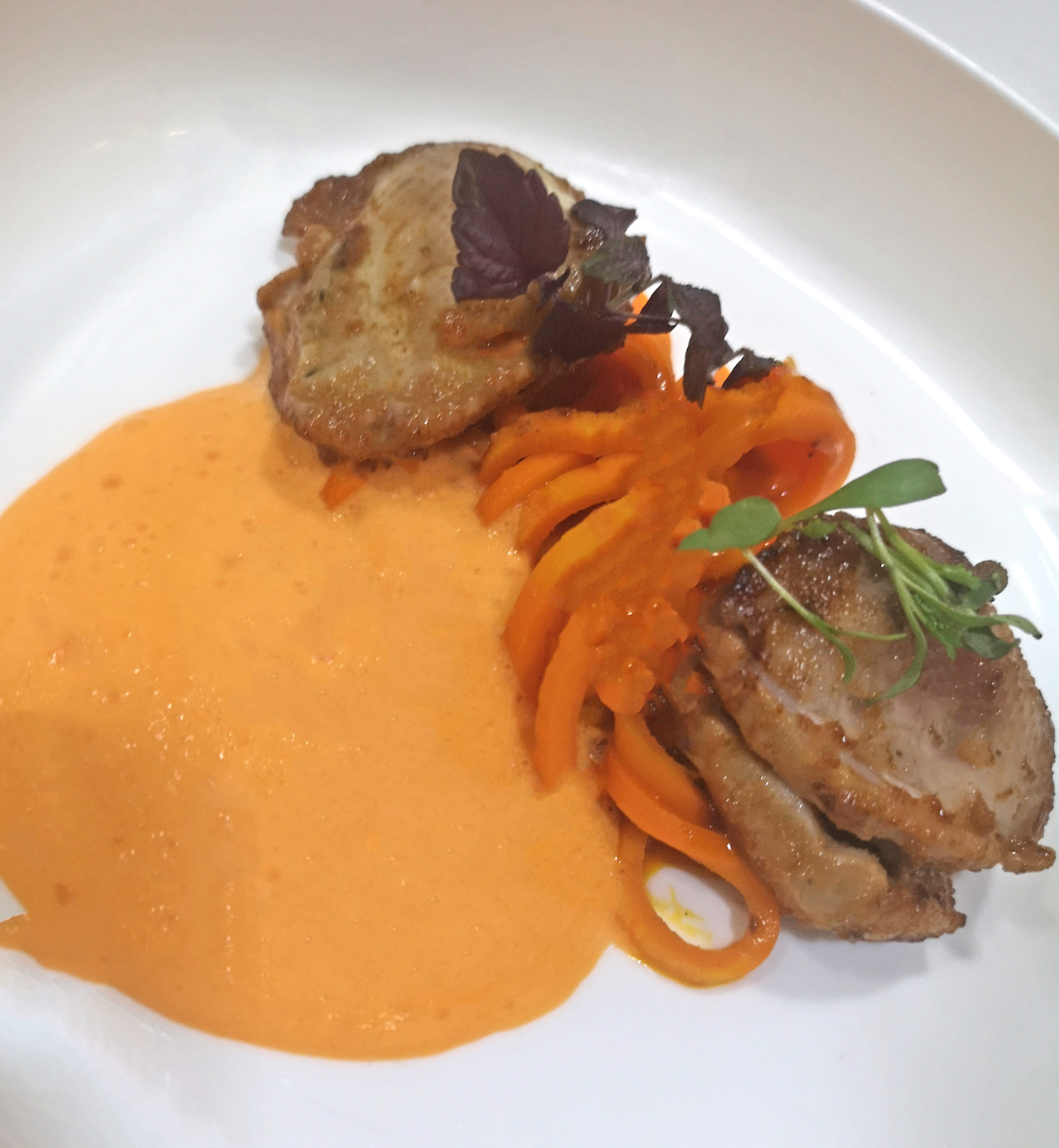 Draai wat wortelspaghetti op een vleesvork of pincet en leg op een bord. lepel wat wortelsaus over de “spaghetti”. Spuit wat schuim naast de spaghetti. Leg een kwartelborstje tegen het geheel aan. Versier met de cress soorten.