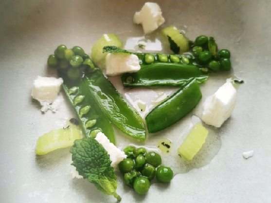 Snijd de bleekselderij in dunne plakjes. Blancheer de groenten afzonderlijk in gezouten water. Doe direct over in ijswater. Dep de groenten droog, snijd de sugarsnaps in 2-en of 3-en en meng de kruiden erdoor. Doe ze samen met de siroop in een vacuümzak en laat 15 minuten onder vacuüm trekken.