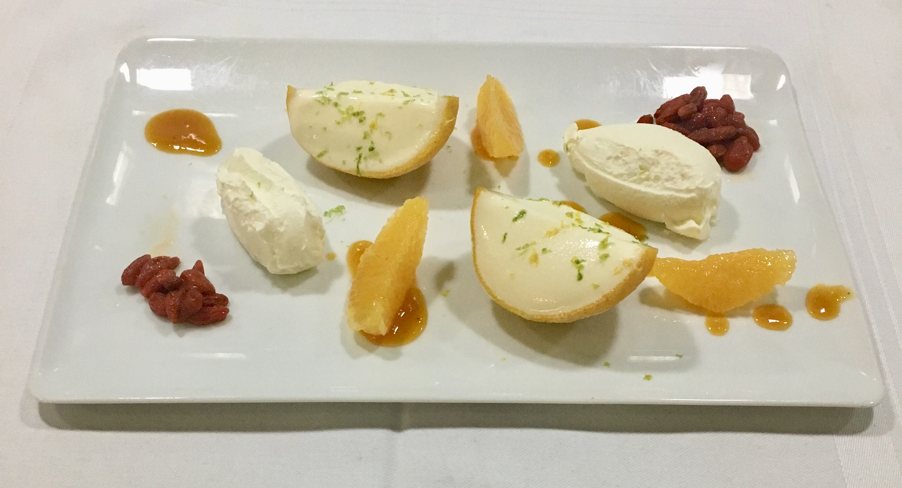 Was de limoenen en sinaasappels en droog ze. Leg een quenelle yoghurtsorbet midden op de borden. Spuit toefjes mascarpone rondom. Verdeel de sinaasappelpartjes rondom. Versier met gedroogde moerbeien en limon cress. Rasp wat limoen- en sinaasappelschil over het geheel. Lepel de rest van de sinaasappelsiroop over de borden.
