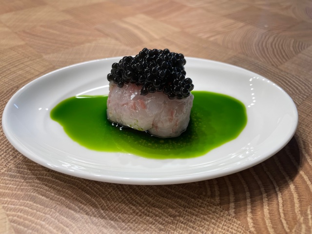 Haal het plastic van de zeebaarsbollen. Rasp wat limoenschil over de vis. Plaats de bollen op de borden en lepel wat bieslookolie rondom. Leg voorzichtig een lepeltje kaviaar op de zeebaars.