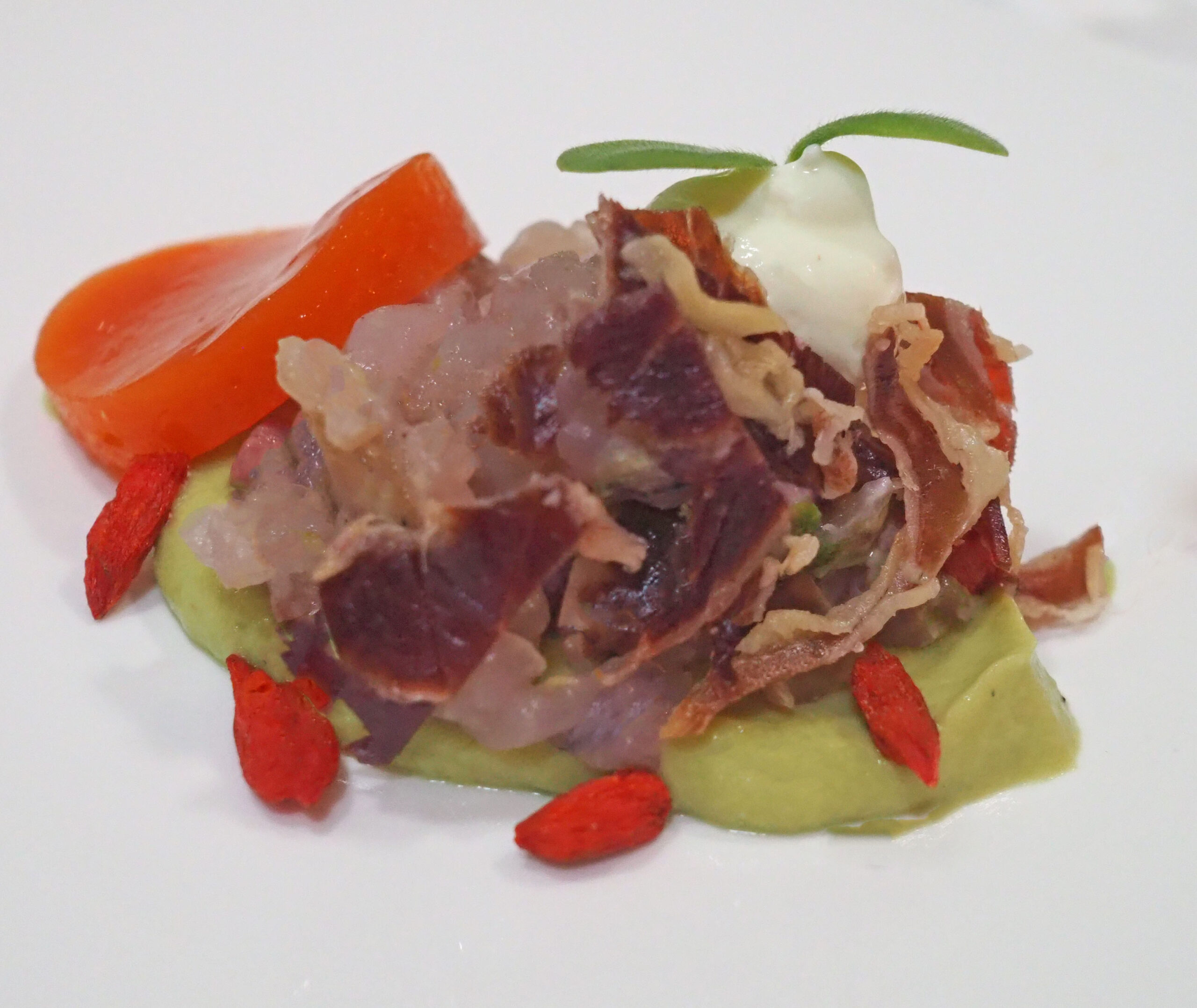 Spuit een dot avocadocrème op een bord en dresseer de tartaar hierop. Leg een stukje pata negra op de tartaar en dan de crostini. Leg hierop de gelei en garneer met de goji bessen en cress.