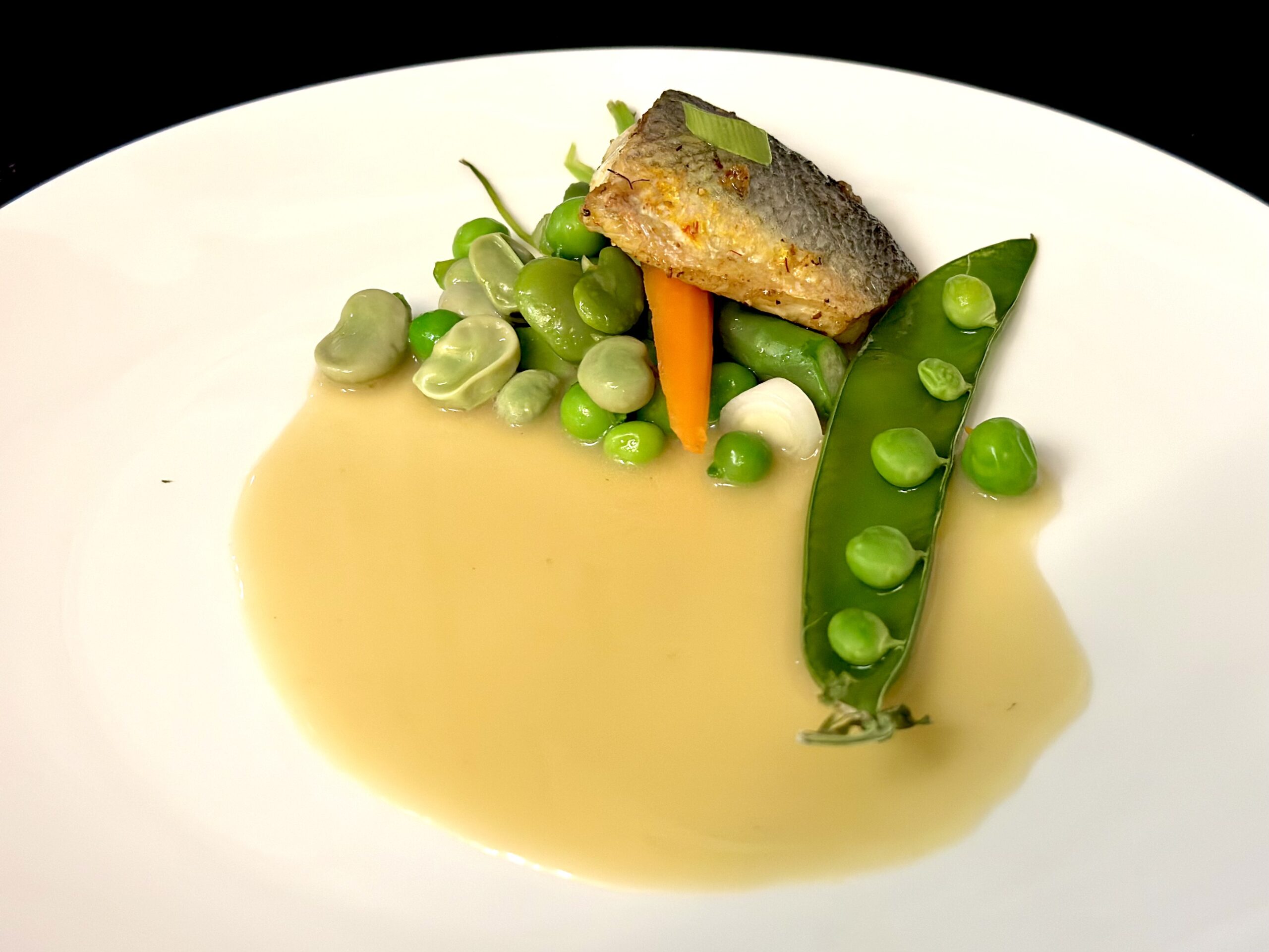 Pel de tuinbonen. Snij de lente-uitjes schuin door in stukken van 1 à 1,5 cm. Schil de wortels en laat 1 cm van het groen zitten. Deel de erwten in de peul van 15 kleine erwten, door deze aan de bolle zijde te openen en voorzichtig los te trekken. Van de erwten blijft dan de helt in elke peul achter. Dop de rest van de doperwten. Verwijder de harde delen van de asperges en snij deze vervolgens schuin in stukken van 2 cm. Maak het blancheervocht door 2 takjes dragon, 10 g suiker en 10 gram zout toe te voegen aan 0,5 liter water. Blancheer achter elkaar in dit vocht de wortels, tuinbonen, doperwten, de doperwten in de peul en de groene asperges. Dubbeldop de tuinbonen. Na het blancheren de groenten direct afkoelen in ijswater. Proportioneer de groenten op een plaat en voeg geklaarde roomboter toe en houdt deze warm in de oven op 80°C.