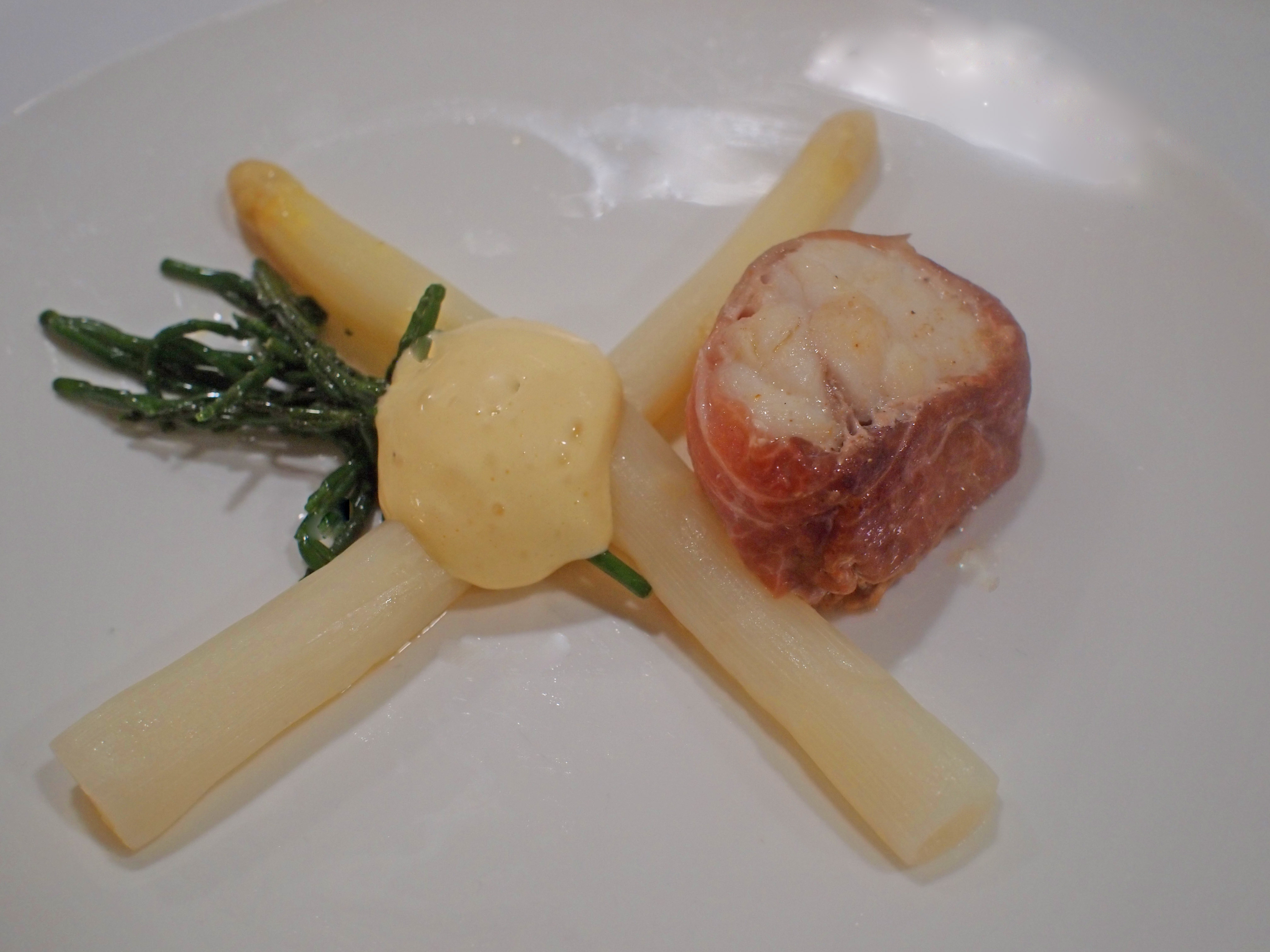Leg de asperges kruislings op de borden. Spuit een flinke toef Hollandaise op de asperges. Schik de zeeduivel tegen het schuim aan. Versier met zeekraal.