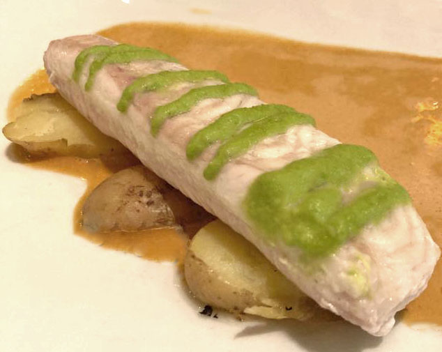 Leg de warme visfilets op een plaat. Spuit dunne strepen doperwtenpuree op de vis. Leg 3 plakjes aardappel in een rij. Leg de vis op de aardappel. Schenk de saus rondom.