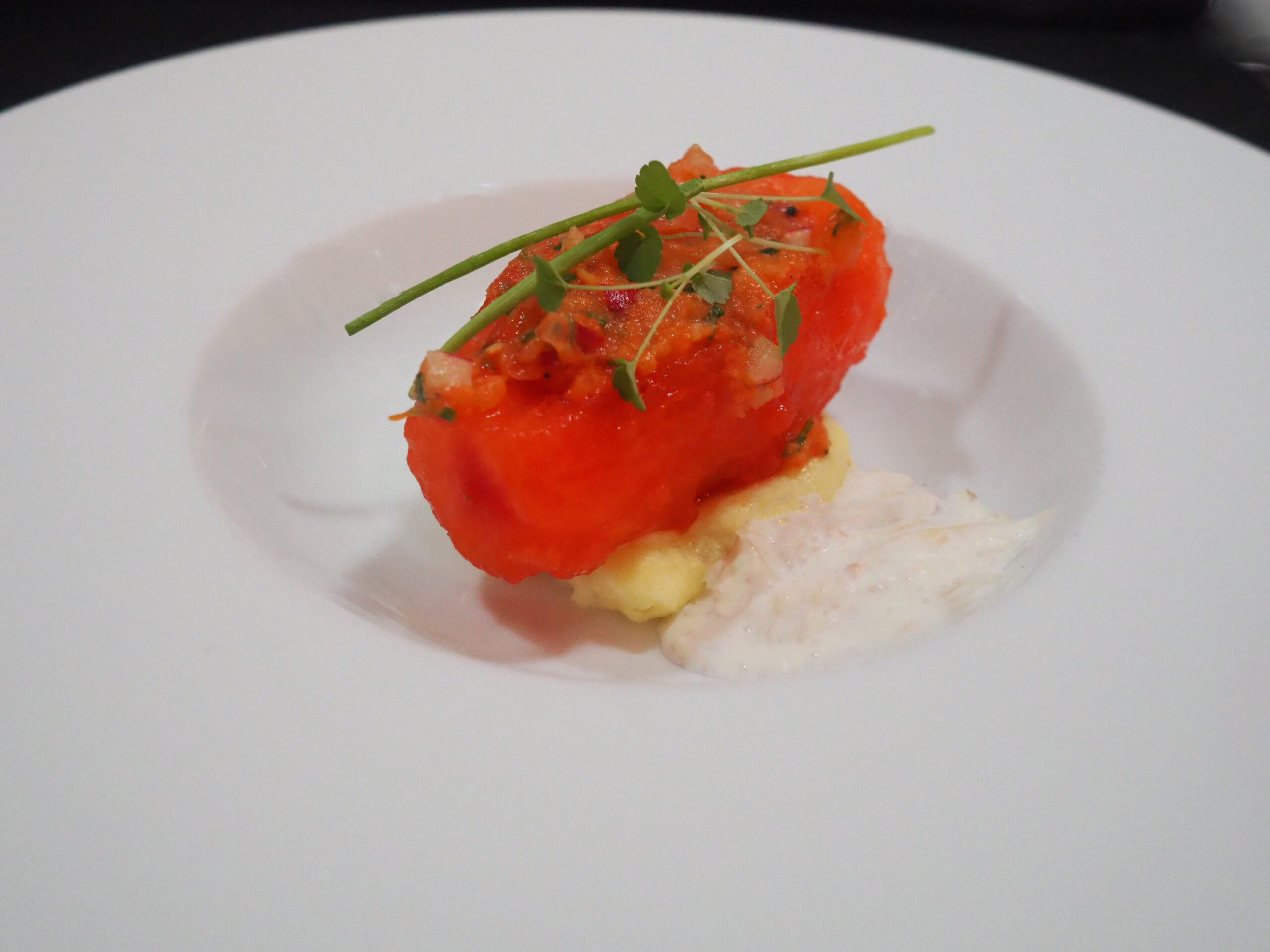 Doe een heel klein beetje puree op de tomaat en ‘plak’ het afgesneden kapje er bovenop.