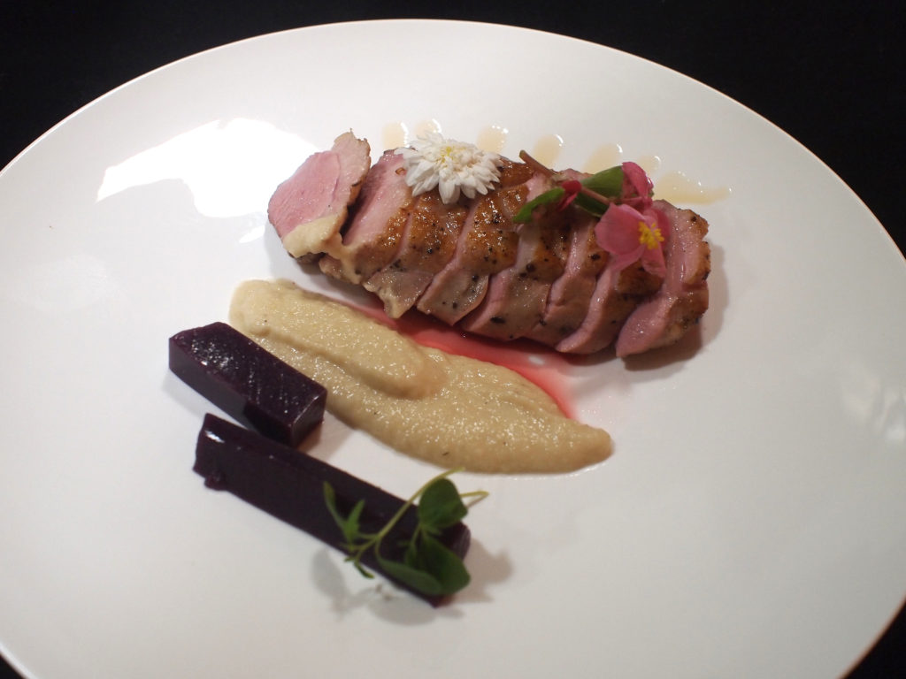 Verdeel de plakken rodekool over de borden en laat onder de warmhoudlampen verwarmen. Trek een streep van uiencrème op de borden. Verdeel de plakken eendenborst dakpansgewijs over de borden en werk af met uiensiroop. Versier de borden met tahoon cress en bloemetjes.