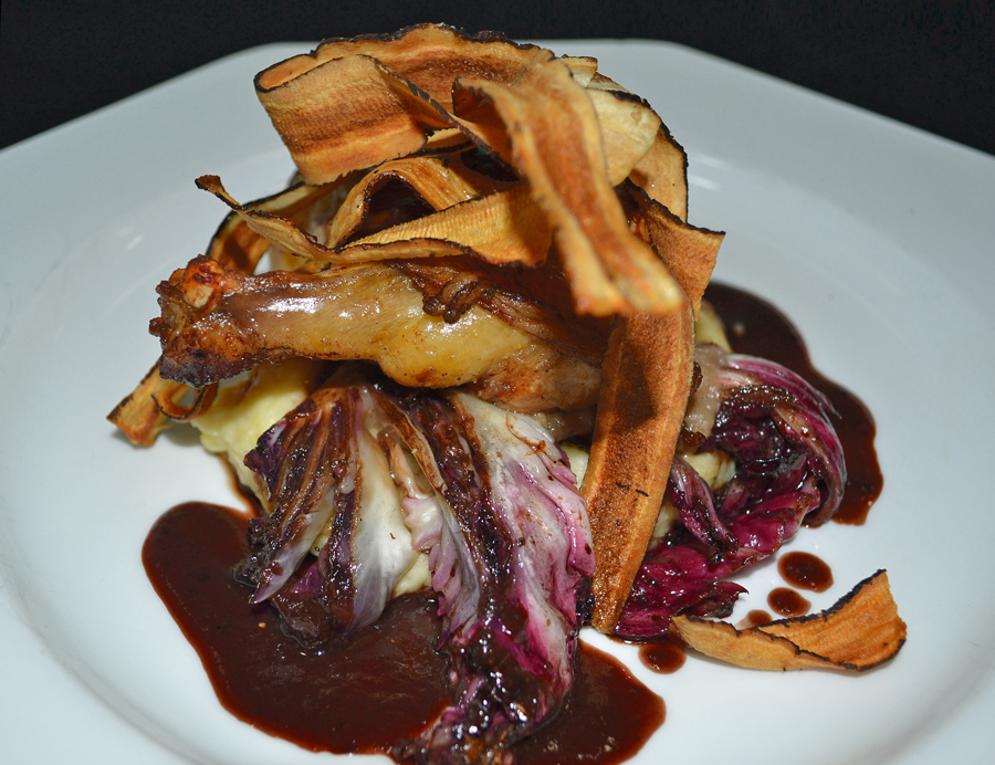 Leg een mooie quenelle pastinaakpuree op de borden. Leg twee stukken radicchio tegen de puree aan. Leg hierop een parelhoeder. Lepel wat bosbessenjus om het geheel en decoreer met schorseneren.