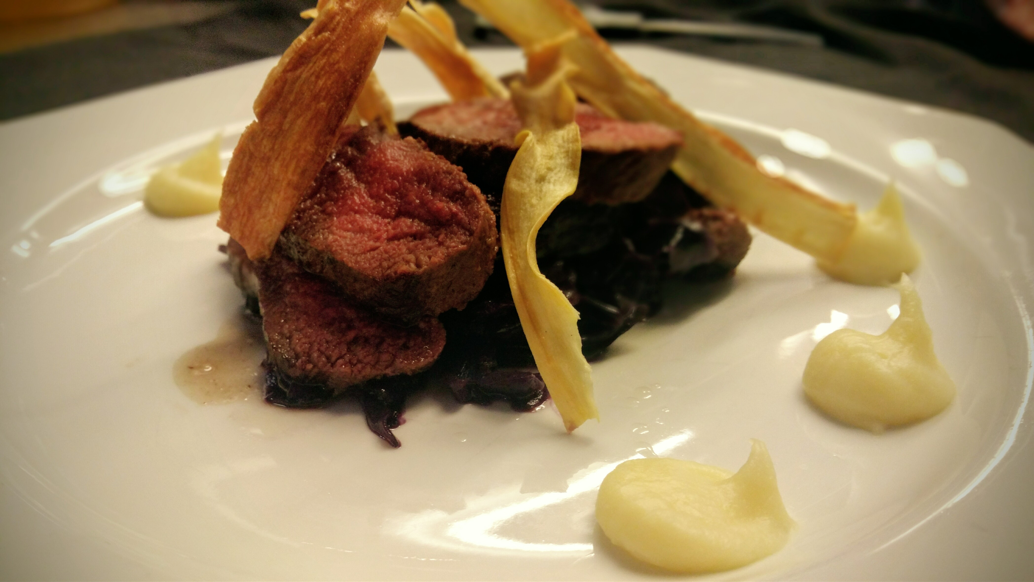 Schep wat rodekool midden op de borden. Leg hierop een plak biet. Spuit kleine toefjes pastinaakpuree langs de rand van de borden. Snij het hertenvlees in plakken en leg ze op de bieten. Schenk de rodewijnsaus rondom en druppel wat olijfolie in de saus. Versier met gefrituurde pastinaak.