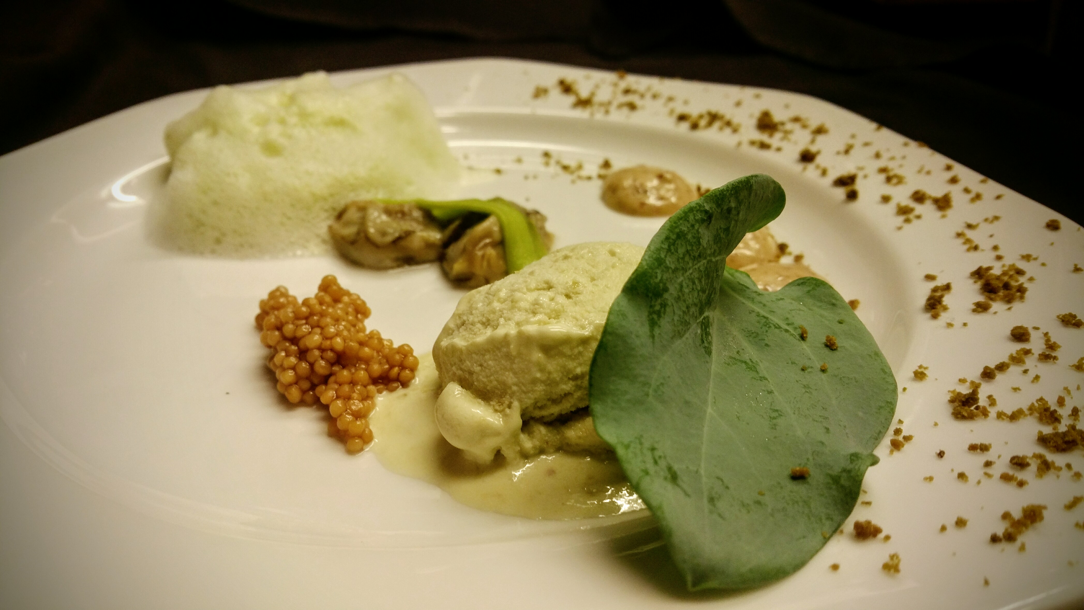 Leg twee oesters midden op de borden. Versier de borden met mosterdzaadjes en olijfpoeder. Leg een bolletje ijs op de borden en wat komkommerschuim. Versier de borden met dotjes mayonaise en slierten komkommer. Leg een oyster leaf tegen het ijs aan.